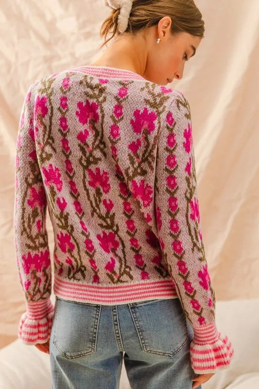 Sweater-SO ME Floral Intarsia Button Up Cardigan